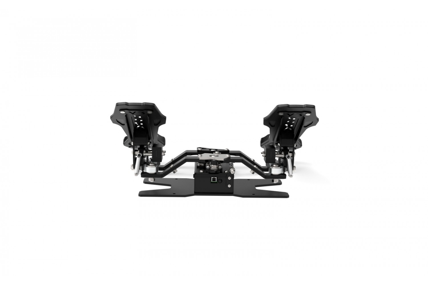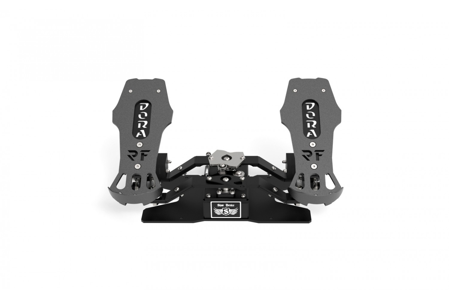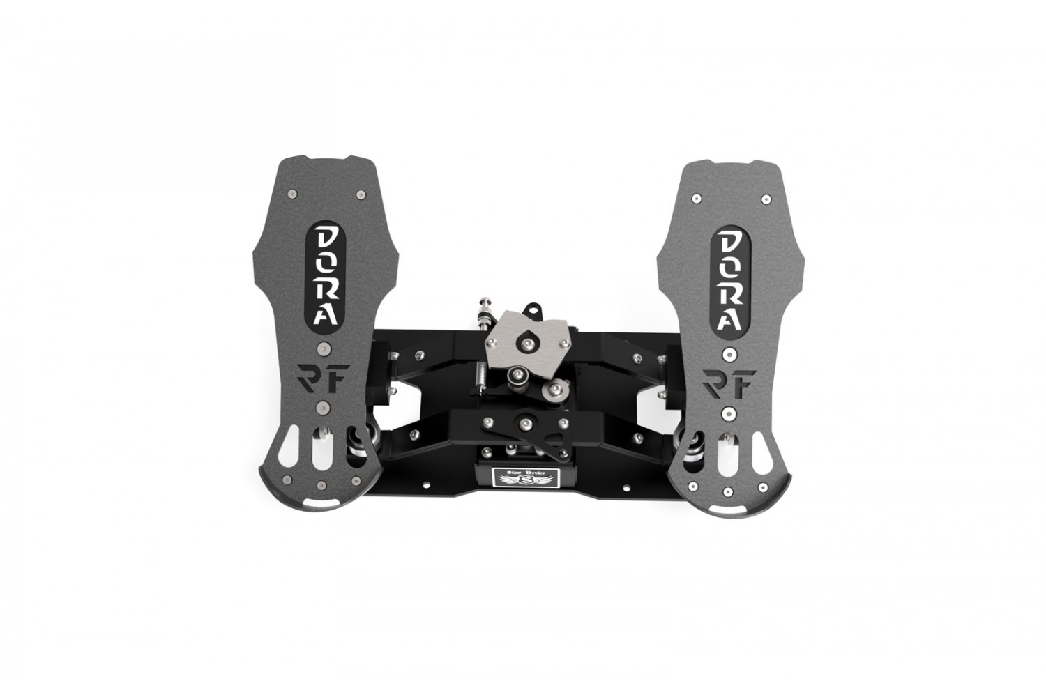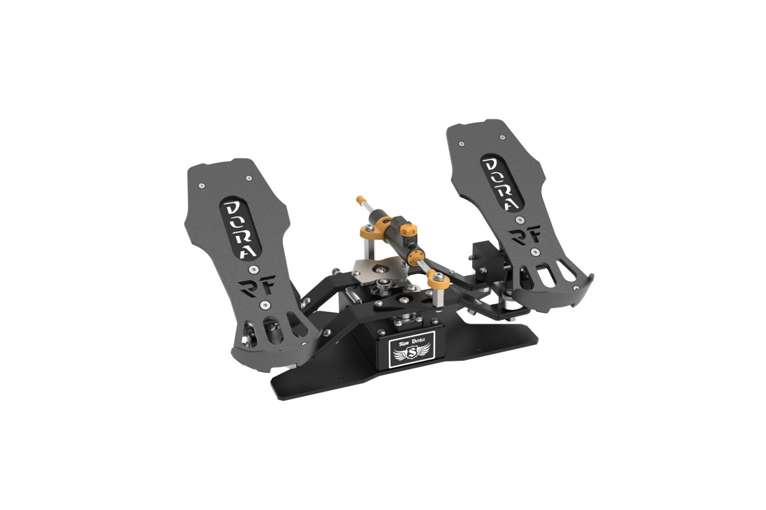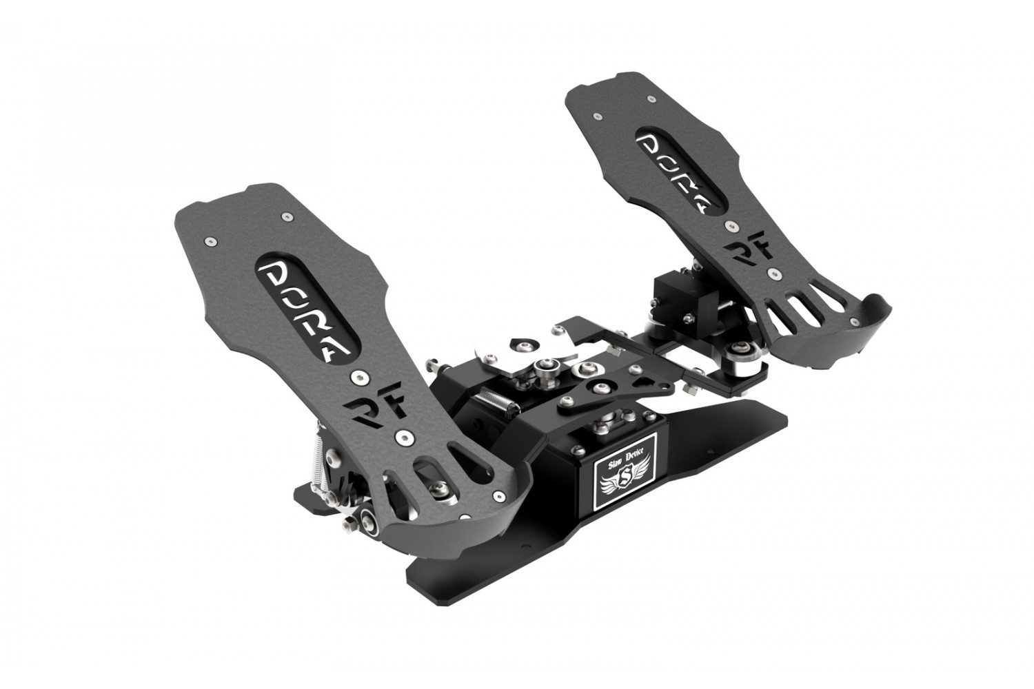 The RF Dora V3 rudder pedals are three-axis rudder pedals designed for use in all flight simulators for steering the rudder axis and two separate toe brakes.